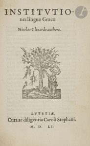 est l’œuvre de l’humaniste, orientaliste, helléniste et hébraïste Nicolaus Clenardus, ou Nicolas Clénard (1495-1542). Elle fut composée à l’usage des étudiants et pour servir plus généralement à ceux qui voulaient apprendre la langue grecque. Elle parut pour la première fois à Louvain en 1530 et sera réimprimée durant plusieurs décennies.. Cette édition est l’un des premiers livres imprimés par Charles Estienne ; elle comprend la dédicace de l’auteur adressée à François Houwers ou Hoverius, son ami intime et condisciple à l’Université de Louvain, que l’on trouve dans l’originale. . La grammaire est suivie des notes du grammairien René Guillon (1500-1570), qui parurent pour la première fois dans l’édition donnée par Wechel en 1541.. Bon exemplaire en reliure du XIXe siècle à l’imitation. Mouillure marginale et sans gravité dans l’angle intérieur bas de quelques feuillets.
