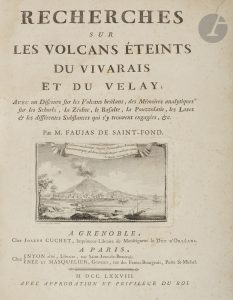 différentes Substances qui s’y trouvent engagées, &c.. Grenoble : Joseph Cuchet ; Paris : Myon aîné, Née, Masquelier, 1778. — In-folio, 406 x 293 : (2 ff.), xviij pp., (1 f.), 460 pp., (2 ff.), 20 planches. Basane fauve, dos à nerfs orné, tête rouge (reliure moderne à l’imitation).. . En français dans le texte, 169.. . Édition originale dédiée au cardinal de Bernis, de ce célèbre ouvrage du géologue et vulcanologue Barthélémy Faujas de Saint-Fond (1741-1819).. L’auteur, consécutivement aux nombreuses recherches, observations et récoltes faites en Auvergne, y développe sa théorie sur la formation des volcans, « théorie plus ingénieuse que toutes celles émises jusque alors sur ce sujet. Elle repose sur la nature chimique de l’eau, qui, suivant l’auteur, doit se trouver infailliblement en communication avec le foyer des volcans qu’elle entretient par sa décomposition » (Nouvelle biographie universelle, 1873, tome 5, 169).. Faujas de Saint-Fond « fut le premier à mener dans cette province (Auvergne) une enquête systématique, le premier à constituer une riche collection des différentes variétés de basalte, le premier à publier le résultat de ses investigations dans un ouvrage in-folio » (En français dans le texte, 169).. L’édition est illustrée d’une vignette sur le titre dessinée et gravée par Savard, représentant une vue de l’Etna en éruption, de . 2 bandeaux, représentant le Vésuve et la montagne en basalte prismatique de Castel à Mare, de 2 lettrines et de 20 très belles planches dont une dépliante.. Exemplaire en reliure moderne à l’imitation. Quelques frottements et épidermures sur les plats. Une partie des feuillets a été lavée. Mouillures claires sans gravité sur la plupart des feuillets et plus prononcées à l’angle inférieur de certains autres, y compris sur les planches. Rousseurs éparses.