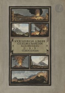 coins, plats de papier dominoté (reliure de l’époque).. . Édition originale du supplément seul, complétant les Observations sur les volcans des deux Siciles parues à Londres en 1776. Elle porte exclusivement sur l’éruption du Vésuve qui se déroula au mois d’Août 1779.. Exemplaire complet du texte mais ne possédant que 3 des 5 planches requises. Ces planches, rehaussées à la gouache et de toute beauté, sont l’œuvre de Pierre Fabris ; elles étaient pratiquement les seules à l’époque à présenter un indéniable intérêt à la fois scientifique et artistique. La première représente 6 vues du Vésuve en éruption, les deux autres, correspondant aux planches 4 et 5 du livre, reproduisent des roches, de la lave, des scories, etc. ramassées au pied du volcan. Les 2 planches manquantes montraient des vues de l’éruption du Vésuve le soir du dimanche 8 août et le matin du 9 août 1779. Un des exemplaires numérisés sur Gallica, dans une reliure quasiment analogue, est également incomplet de ces 2 planches.. Exemplaire dérelié, reliure très abîmée, manques au dos, importantes épidermures. On a collé des cartes géographiques anciennes sur les contreplats. Rousseurs.. Provenance : Edward King, avec signature sur la première garde blanche.