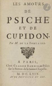 LA FONTAINE (Jean de).. Les Amours de Psiché et de Cupidon. [Suivi de] : Adonis. Poëme.. Paris : Claude Barbin, 1669. — In-8, 167 x 106 : (12 ff.), 500 pp. Maroquin orange, triple filet doré en encadrement sur les plats, dos à nerfs orné,...