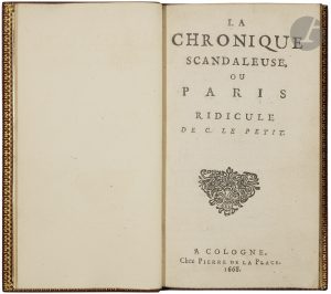 tranches dorées (Thibaron-Joly).. . Willems, 1792. - Lacroix, Paris ridicule et burlesque au dix-septième siècle, 1876.. . Édition originale rarissime, conforme à la description de Willems, avec le fleuron sur le titre et en 47 pages.. Paul Lacroix consacra une longue notice sur le livre et l’auteur dans son Paris ridicule et burlesque au dix-septième siècle paru en 1876. L’auteur de ce poème était le malheureux écrivain Claude Le Petit (1638-1662), débauché et mauvais garçon malgré sa qualité d’avocat au Parlement de Paris, condamné à être étranglé et brûlé pour avoir été surpris faisant imprimer des chansons impies et libertines de sa composition.. Cette Chronique scandaleuse n’était pas l’objet de sa condamnation, même s’il s’agit d’une « satire en forme d’ode burlesque, de quoi faire fouetter le libraire, emprisonner l’imprimeur et brûler l’auteur » (Paul Lacroix, II). « Il est probable que ce poëme circula d’abord manuscrit, et passa de bouche en bouche dans la société des libertins de Paris : c’eût été jouer gros jeu que de faire imprimer, même en cachette, un ouvrage aussi hardi, qui s’attaquait à tout, aux choses de la terre comme aux choses du ciel, sans avoir l’air de rien prendre au sérieux » (Idem). . Initialement composé vers 1655, ce poème est pour Lacroix devenu désormais une pièce historique « très-précieuse et très-originale, qui reproduit avec beaucoup de vérité (en faisant la part de l’hyperbole) la physionomie physique et morale de Paris avant 1660 » (Lacroix, p. XV).. Ce fut donc de façon posthume et clandestine que le poème vit le jour, imprimé vraisemblablement à Amsterdam sous la fausse adresse de Pierre de la Place à Cologne. Il parut 2 éditions à la date de 1668, celle-ci, en 47 pages, considérée comme la première, « des plus rares » selon Willems, et l’autre en 50 pages sortant des presses bruxelloises de François Foppens. Lacroix considérait également cette édition comme « fort rare » et estimait que peu d’exemplaires avaient pénétrés en France. « Leur rareté les fit rechercher davantage, et les copies manuscrites du poëme, plus ou moins tronquées, continuèrent à se multiplier » (Lacroix, p. XVI).. Très bel exemplaire en pleine reliure de Thibaron-Joly, parfaitement conservé.