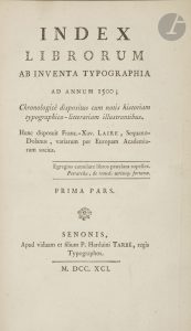 Pierre-Hardouin Tarbé, 1791.. [Suivi de] : DEBURE (Guillaume). Catalogue des livres de la bibliothèque de M***. Faisant suite à l’Index librorum ab inventa typographia ad annum 1500. . Paris : G. de Bure, 1792. — 3 tomes en 2 volumes in-8, 196 x 120 : (2 ff.), viij, 475 pp. ; (2 ff.), 464 pp. ; (2 ff.), 112 pp. Basane beige, dos lisse orné, tranches mouchetées (reliure du XIXe siècle).. . Ce catalogue, divisé en 3 parties, est celui de la collection de l’homme politique, archevêque de Sens et cardinal Étienne Charles de Loménie de Brienne (1727-1794).. Les deux premières parties furent rédigées par François Xavier Laire (1738-1801), bibliothécaire du cardinal et l’un des bibliographes les plus réputés du XVIIIe siècle. Tirées à 500 exemplaires, elles contiennent la description de 1332 incunables, dont 2 exemplaires de la Bible de Gutenberg, et de 56 manuscrits, le joyau de la bibliothèque de Loménie de Brienne.. Exemplaire complet du 3e tome rédigé par Guillaume Debure, proposant un complément de plus de 600 ouvrages précieux des XVIe, XVIIe et . XVIIIe siècles provenant de la même collection, vendus le 12 mars 1792.. Travaux de vers et frottements aux dos.