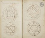 misterieuses, de Talismans pentacules, cercles, canderies et caractères avec la manieres de les composer. Avec une ample Explicaon des principes de la science oculte des plus fameux nécromanciens qui ont vécu depuis Salomon jusqu’à present.. Bellegrade, 1630. — Manuscrit in-8, 181 x 115 : (1 f.), 199 pp. mal numérotées 189, 42 pp. Veau marbré, dos à nerfs orné, tranches mouchetées (reliure de l’époque).. . Manuscrit cabalistique de la fin du XVIIe siècle, parfaitement calligraphié en noir et rouge, réglé en rouge, comprenant le dessin de 66 pentacles et de nombreux tableaux, carrés magiques, sceaux et symboles ésotériques.. Dans la tradition biblique Salomon est considéré comme un grand roi bâtisseur et sage ; il s’enrichira dans l’Antiquité tardive d’une dimension d’un roi faiseur de miracles. C’est dans l’un des plus anciens traités de démonologie, intitulé Le Testament de Salomon, rédigé en grec au IIIe siècle, que Salomon apparaît pour la première fois comme un magicien, construisant le Temple en commandant aux démons au moyen d’un anneau magique confié par l’archange Gabriel. Cette tradition d’un roi magicien perdurera tout au long des siècles dans le judaïsme puis dans le christianisme et resurgira à la Renaissance avec ce texte des Clavicules de Salomon dont on connaît de très nombreuses copies. Censé, selon la légende, avoir été écrit par le roi Salomon lui-même, il est supposé donner les « clavicules », ou « clés », pour accéder à la connaissance suprême et aux richesses, et révéler les sceaux et rituels magiques que le roi utilisa pour entrer en contact avec les mondes intermédiaires et les esprits. La première apparition de ce grimoire remonterait au XIe ou XIIe siècle.. . Il subsiste aujourd’hui plus de 100 manuscrits portant le titre des Clavicules de Salomon, écrits entre le XVe et le XVIIIe siècle et rédigés dans plusieurs langues dont le latin, le grec, l’italien, l’anglais, l’allemand, le néerlandais, le tchèque et le français. . Il s’en trouve également en hébreu et en arabe. Les textes de ces manuscrits sont très différents et il n’en existe aucune version définitive. Tous sont donc recherchés.. . Le manuscrit que nous proposons ici, présenté comme donnant la traduction de Pierre Morissonneau « professeur des langues orientales et sectateur de la philosophie des cabalistes », est daté de 1630 et se compose de 17 chapitres :. I. Quelles dispositions doit avoir celuy qui veut participer aux secrets de la science cabalistique. - II. Quels sont les lieux et les temps propres aux opérations du grand Art. - III. Des matières qui servent aux opérations & de la manière des les préparer cabalistiquement. - IV. Quels sonts les Instrumens qui sont nécessaires aux opérations du grand art. - V. Quelles sont les Influences & les vertus secretes que les differentes situations ou se trouve la lune donnent aux opérations de l’art. - VI. De la manière de Travailler aux figures. Talismans, caractères, suivant les Reigles de l’art. - VII. Des heures du jour et de la nuit pour les sept jours de la sepmaine par raport aux planètes qui les dominent. - VIII. Des parfums propres aux sept planètes pour chaque jour de la semaine et la ma(nière) de les composer. - IX. Des oraisons, invocations & conjurations pour chaque jour de la semaine. - X. Dans lequel on explique la maniere de faire des Pentacules, suivant la methode des anciens Rabins qui ont esté les plus habiles dans la science oculte & cabalistique. - XI. Des couleurs qui sont propres aux sept planetes &aux Esprits qui dirigent leurs influences. - XII. Des choses qui sont specialement affectées, propres & consacrées aux sept planetes & aux Esprits qui dirigent leurs Influences. - XIII. Des anneaux mistérieux dont les plus anciens docteurs de la cabale se sont servi avec un merveilleux succez. - XIV. Des oraisons en forme dexorcismes pour consacrer toutes les choses qui servent aux operations du grand art. - XV. Des songes misterieux et de la manière de se préparer a en avoir tels qu’on les peut souhaitter & qui tiennent lieu de révélation pour ce que l’on veur scavoir. - XVI. Dans lequel on continue de donner des secrets exaxtement curieux & utiles. - XVII. Conclusion de cet ouvrage par des secrets Naturels qui sont très merveilleux.. Dans cette dernière partie se trouvent des recettes « pour donner de l’amour », « pour garantir du cocüage », « pour connoistre si une femme manque de fidélité à son mary », « pour guérir de l’amour d’une femme dont on seroit enchanté par un philtre amour », « pour rendre le vin haissable à un yvrogne », « pour Entendre le jargon des bêtes et le chant des oyseaux », ou encore « pour rompre des cordes neuves dont on seroit lié et garotté », etc.. La table que l’on trouve après le traité, a été amputée à l’époque des 4 feuillets qui la composaient ; on y trouve uniquement le début qui figure au verso de la dernière page du texte, avec cette mention : « Elle est fauce. ». . Le manuscrit se termine par 42 pages écrites d’une autre main mais à la même époque, proposant des superstitions, des recettes magiques et parfois des sortilèges : « Mettre le cœur d’un crapaud sur la mamelle d’une femme, pendant quelle dort afin de luy faire dire son secret », « Manger de la chair d’une beste tuée du même fer dont on a tué une personne pour guérir l’Epilepsie », « Boire du vin dans lequel on aura trempé une Espée dont on aura coupé la testes à une personne pour guérir la fièvre quarte », « pour fievre composée de la quotidienne, la continüe et de la Tierce intermitente, porter sur soy à son cou un billet sur lequel abracadabra est écrit en lettres grecques », etc. Nous y trouvons également « trois exorcismes de Malleosus ou Hemmerlin chanoine de Zuric qui vivoit l’an 1454. ». . Les manuscrits fran