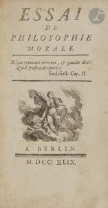 [MAUPERTUIS (Pierre-Louis Moreau de)].. Essai de philosophie morale.. Berlin, 1749. — In-12, 164 x 92 : (2 ff.), 107 pp. Veau marbré, filet à froid en encadrement sur les plats, dos à nerfs orné, tranches rouges (reliure de l’époque).. ....