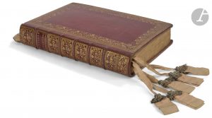 1741. — In-folio, 371 x 246 : frontispice, (10 ff.), XL, 566, CXXXIX pp., (2 ff.), 1 planche. Maroquin rouge, large dentelle dorée en encadrement sur les plats, composée de fleurs, grenades, oiseaux et d’une tulipe aux angles, dos à nerfs orné, roulette dorée intérieure, gardes de papier doré gaufré à motifs de fleurs et grenades roses, tranches dorées, signets de soie (reliure de l’époque).. . Très beau missel à l’usage du diocèse de Bourges, dédié à l’archevêque de ladite ville Frédéric-Jérôme de La Rochefoucauld (1701-1757).. L’édition est illustrée des armes de La Rochefoucauld gravées par Nicolas-Jean-Baptiste de Polly, et de deux belles planches gravées par le même d’après deux tableaux de Charles Le Brun.. Très bel exemplaire en maroquin rouge de l’époque orné d’une dentelle à l’oiseau, aux grenades et aux tulipes. Les gardes présentent un superbe papier doré et gaufré de l’époque. On compte 3 signets collés, sur les 9 requis, et 5 signets en soie rose reliés entre eux par un coussinet couvert de soie brochée et se terminant par des pampilles en dentelle de fils d’argent.. Exemplaire très bien conservé. Ce missel est très rare dans cette condition.