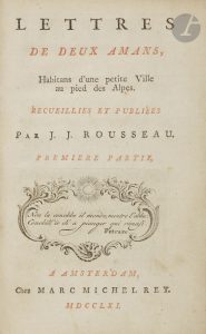 ROUSSEAU (Jean-Jacques).. Lettres de deux amans, Habitans d’une petite Ville au pied des Alpes.. Amsterdam : Marc Michel Rey, 1761. — 6 volumes in-12, 163 x 99 : (8 ff.), 407 pp., 2 planches ; (2 ff.), 319 pp., 3 planches ; (2 ff.), 255 pp., 2...
