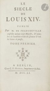 tranches dorées (M. Godillot).. . Bengesco, I, pp. 340-344, n°1178.. . Édition originale, tirée à 3 000 exemplaires, de ce célèbre ouvrage de Voltaire.. Il fut publié, d’après le titre, par les soins de Joseph Du Fresne de Francheville (1704-1781) qui n’était en réalité qu’un prête-nom de Voltaire, rétribué simplement pour corriger les épreuves et obtenir le privilège d’impression.. Cet essai représente plus qu’une biographie du roi Soleil, il propose une étude sur les mœurs, les structures politiques, économiques et sociales du royaume, les sciences, les arts, les lettres ainsi que sur les relations de la France avec les pays limitrophes. Cette approche était à l’époque tout à fait nouvelle et l’ouvrage connut de ce fait un très grand succès d’où la publication de nombreuses éditions et contrefaçons.. Bengesco signale 2 particularités qui caractérisent cette édition, d’une part il n’y a pas une seule capitale dans tout l’ouvrage, excepté en tête des paragraphes, et d’autre part il s’agit du premier livre imprimé « tout entier » avec l’orthographe de Voltaire.. Très bel exemplaire en maroquin de Marcel Godillot ; la reliure a été réalisée entre 1938 et 1975.. Quelques rares feuillets brunis.