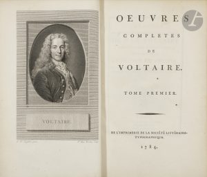 intérieure, tranches dorées (reliure du temps).. . Bengesco, IV, p. 105, n°2142.. . Célèbre édition, dite de « Kehl », publiée sous la direction de Condorcet et Decroix, imprimée par Beaumarchais dans l’imprimerie que celui-ci avait installée spécialement au fort de Kehl, avec les caractères gravés par Baskerville qu’il avait récemment acquis. Quelques pièces et une partie de la correspondance paraissent ici pour la première fois.. Exemplaire comprenant tous les volumes à la date de 1784, sauf les tomes 36 et 45, datés de 1785 et le dernier publié en 1789. Imprimé sur beau papier vergé, il est enrichi des figures que l’on ne trouve généralement que dans les exemplaires sur grand papier. Il comporte au total 126 planches, soit :. - 16 portraits, à savoir :. 3 de Voltaire gravés par Pierre-Alexandre Tardieu d’après Nicolas de Largillière, par Pierre Gabriel Langlois d’après Maurice-Quentin de La Tour et Houdon,. 1 de Henri IV gravé par Pierre-Alexandre Tardieu d’après Frans Pourbus, . 1 de Charles VII gravé par Maviez, . 1 d’Agnès Sorel gravé par Maviez d’après Moreau le Jeune (en second tirage), . 1 du comte de Dunois gravé par Fossoyeux, . 1 de Jeanne d’Arc gravé par Beisson, . 1 de Louis XIV gravé par Fosseyeux d’après Le Brun et Moreau le Jeune, . 1 de Charles XII gravé par Tardieu, . 1 de Pierre Ier gravé par Langlois d’après Caravaque, . 1 de Madame du Châtelet par Langlois d’après Marie Anne Loir, . 1 du comte d’Argental par Fosseyeux d’après Defraine, . 1 de Frédéric II gravé par Langlois d’après Van Loo, . 1 de Catherine II gravé par Fosseyeux, . 1 de d’Alembert gravé par Maviez d’après De La Tour.. Il manque les portraits de Louis XV et de Frédéric Guillaume prince de Prusse.. - Un frontispice au dernier volume, gravé par Louis Croutelle d’après Moreau le Jeune.. - Une planche dépliante « Tableau des œuvres de Voltaire, contenues dans cette édition » (volume 70).. - 93 compositions de Moreau le Jeune, dont 44 pour le théâtre, 10 pour La Henriade, 21 pour La Pucelle, 4 pour les contes en vers et 14 pour les romans.. - 1 plan de bataille hors texte dans le tome 24 consacré à l’Histoire de Russie.. - 14 planches proposant 54 figures pour le volume consacré à la Physique (volume 31).. . Exemplaire complet des 3 feuillets entièrement gravés comprenant le titre Estampes destinées à orner l’édition in-octavo de M. de Voltaire, gravé par Beaublé, le portrait du prince de Prusse gravé par Dambrun d’après Moreau le Jeune, daté de 1784, et la dédicace qui lui est adressée par Moreau le Jeune. Ces 3 feuillets sont reliés en tête du premier volume.. . Très bel exemplaire, en reliures légèrement postérieures. Certaines reliures ont été habilement et discrètement restaurées. Déchirure sans manque, avec atteinte au texte, au faux titre du tome 7, et avec manque dans la marge basse du dernier feuillet du tome 46. Décharge des gravures sur les feuillets en regard. Mouillures sans gravité sur quelques feuillets.