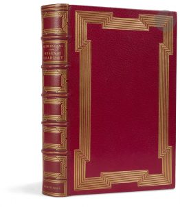 BALZAC (Honoré de).. Eugénie Grandet.. Paris : Motteroz pour Les Amis des livres, 1883. — In-8, 244 x 160 : (2 ff.), 345 pp., (6 ff. 3e blanc), 8 planches, couverture imprimée. Maroquin rouge, multiples filets dorés, brisés aux angles, en...