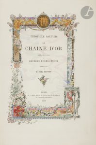 laquelle s’enlace un long rameau doré et mosaïqué de maroquin vert et marron, tête dorée, non rogné, couverture et dos conservés (Champs-Stroobants).. . Première édition séparée de ce conte paru pour la première fois dans la Chronique de Paris en 1837 et inséré en 1839 dans le recueil Une larme de diable. Elle est illustrée de 16 compositions de Georges Rochegrosse, dont une sur la couverture, gravées au trait, imprimées en taille-douce et coloriées au pinceau.. Tirage limité à 200 exemplaires imprimés sur papier vélin fort, numérotés et timbrés par le cercle de la librairie et portant sur le faux titre la signature de Georges Rochegrosse.. Très bel exemplaire relié par Champs-Stroobants, enrichi d’une suite des illustrations en noir.