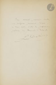plats, dos lisse orné d’une banderole de maroquin marron contenant le nom de l’auteur et le titre en lettres dorées, sur laquelle est assis un chérubin en maroquin beige tenant une coupelle et une torche dorées, surmontant des tiges fleuries dorées et mosaïquées de maroquin rouge et ocre, et un éventail de maroquin rouge d’où jaillit une jambe de femme, tenue à 2 mains, chaussée d’une mule de maroquin orange et ocre, tête dorée, non rogné, couverture conservée (reliure de l’époque).. . Cette belle édition, tirée à seulement 110 exemplaires, est illustrée de 56 compositions de Charles Léandre, dont 27 eaux-fortes gravées par Muller, parmi lesquelles 10 hors-textes, une vignette de titre, 8 en-têtes et 7 culs-de-lampe, ainsi que . 29 vignettes dans le texte, gravées sur bois par Leveillé et Ruffe.. Un des 35 exemplaires sur papier de Chine extra-fort, comprenant 4 états des eaux-fortes et 2 des vignettes gravées sur bois.. Exemplaire comprenant cette note autographe de l’auteur sur la première garde blanche :. Une armée purement civile, une religion purement laïque, . en deux mots voilà le programme politique de Monsieur Cardinal. Ludovic Halévy. . On trouve aussi reliée en tête une L.A.S. de l’auteur, 1 p. 1/2 in-18, adressée à un confrère : « vous pouvez compter absolument sur moi pour les élections de jeudi. Votre candidature par malheur se produit un peu tard et à un moment où bien des engagements ont déjà été pris… » . Exemplaire également enrichi d’un portrait de l’auteur gravé par Abot, daté de 1887, en 2 états (sur papier vergé et sur japon avec remarque), de 2 eaux-fortes gravées par Abot, figurant les filles Cardinal remettant le bicorne d’académicien à l’auteur, dont l’une d’après Mas en 4 états (le premier tiré à 25 exemplaires), et l’autre également en 4 états (noir (tirée à 15 exemplaires), vert, bleu et sanguine).. Bel exemplaire en reliure mosaïquée non signée mais de très bonne facture, attribuable à Charles Meunier.. Dos très légèrement passé, un coin restauré.
