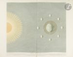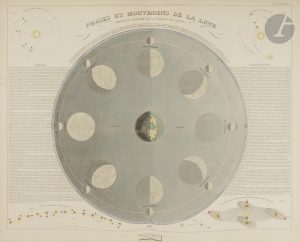 collée sur le premier plat, dos lisse orné (reliure vers 1850).. . Édition originale de l’atlas seul, que l’on trouve presque toujours ainsi mais qui devait être accompagné à l’origine d’un précis in-12 comme indiqué sur le titre.. Il se compose de 7 superbes planches en couleurs sur double page, gravées par A. Gianni d’après les dessins de Sigismond Visconti pour les 5 premières, par Visconti revu par Auguste-Henri Dufour pour la 6e et par Dufour pour la dernière.. Ces 7 planches sont ainsi titrées : Système solaire. - Orbite de la Révolution annuelle de la Terre autour du Soleil avec l’indication des Saisons. - Phases de la Lune. - Éclipses de Soleil et de la Lune. - Le Flux et Reflux. - Coupe de la Terre prise sur l’Equateur et vue du côté du Pôle Arctique. - Planisphère.. Exemplaire enrichi de 5 autres planches en couleurs dont 4 sur double page, issues de l’Atlas universel, à savoir : Tableau général de cosmographie (étiquette « Longuet, Succr de Simonneau, vers 1839). . - Cosmographie générale (Atlas universel, imprimerie Didot, vers 1850). - Mouvemens apparens du Soleil, théorie des saisons (Atlas universelle publié par Andriveau-Goujon, daté 1837). - Phases et mouvemens de la Lune dressé et dessiné par Soulier (de Sauve) (Atlas universel, 1839). - Révolution annuelle de la Terre autour du Soleil. (Atlas universel publié par Andriveau-Goujon, vers 1840).. Bon exemplaire dont chaque planche a été montée sur onglet.. Frottements et épidermures au dos, coins émoussés. Déchirures sans manque aux pliures des 7 planches de l’atlas. La déchirure de la première planche (Système solaire) s’est étendue en partie sur la partie gauche de la gravure.