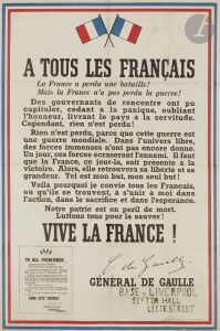 GAULLE (Charles de).. À tous les français. La France a perdu une bataille ! Mais la France n’a pas perdu la guerre !. Londres : Printed for Général de Gaulle by J. Weiner, [1940]. — Affiche in-plano, 745 x 489 (cadre imprimé bleu, blanc,...