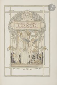 demi-maroquin bleu nuit à coins, filets dorés, dos lisse orné d’étoiles dorées, non rogné, couverture et dos conservés (E. Carayon).. . Cette remarquable édition, imaginée par Henry Couderc de Saint-Chamant, réunit les quatre poèmes élégiaques qu’Alfred de Musset avait rédigés après sa rupture avec George Sand.. Conçue comme un véritable ouvrage d’art, elle est illustrée de cinq compositions à pleine page, dont le frontispice, et de 4 bandeaux par Luc-Olivier Merson, gravés à l’eau-forte par Charles Chessa et imprimés en couleurs à la poupée par Alfred Porcabeuf, ainsi que d’un titre, 4 faux titres, un médaillon, un achevé d’imprimer et d’un encadrement à chaque page par Adolphe Giraldon, gravés sur bois par Ernest Florian et imprimés en couleurs par Charles Eyménié. Le texte a été composé avec les caractères Giraldon de la fonderie Deberny.. L’édition débute par une belle préface d’Edmond Haraucourt composée spécialement pour le livre.. . Le tirage a été limité à 161 exemplaires. Celui-ci, portant le n°37, est l’un des 120 sur vélin d’Arches et plus précisément l’un des 19 sur ce papier enrichis de 2 suites des eaux-fortes (en noir avec remarque et eau-forte pure avec remarque).. Très bel exemplaire relié par Carayon.. Dos et bord supérieur du premier plat légèrement insolés.