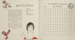 Composée de 14 feuillets, elle propose une présentation des différents produits, accompagnée de dessins en couleurs dans le style typiquement art déco. En regard se trouve un damier vide ou un feuillet de papier noir découpé en carrés de même dimensions.. Cette publicité ludique est ainsi présentée en tête de la plaquette : « La Maison Dorin se fait un plaisir d’offrir à sa clientèle cet album qui lui permettra de prendre part avec le maximum de facilités et, par suite, de chances, à tous les jeux de mots croisés qui l’intéresseront. . On trouvera dans les pages suivantes des damiers et, en outre, des feuilles de papier noir découpées en carrés de mêmes dimensions que ceux des damiers destinés à être collés en position convenable sur chacun d’eux. Grâce à ce dispositif, on produira sur le damier le problème de mots croisés qu’on se propose de résoudre. » Viennent ensuite les règles à suivre pour jouer correctement.. Exemplaire parfaitement conservé et absolument complet.