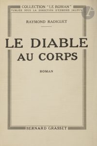 RADIGUET (Raymond). Le Diable au corps. Roman.. Paris : Bernard Grasset, 1923. — In-8, 188 x 137 : 238 pp., (1 f. blanc), couverture imprimée. Demi-maroquin bleu à coins, filets dorés, dos à nerfs orné, tête dorée, non rogné, couverture et...