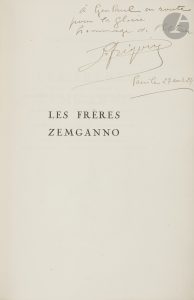 BROUET (Auguste) - GONCOURT (Edmond de).. Les Frères Zemganno.. Paris : F. Grégoire, 1921. — In-4, 277 x 190 : (2 ff.), VIII pp., (1 f.), IV, 236 pp., (3 ff. 2 derniers blancs), 15 planches, couverture illustrée. Maroquin bleu nuit janséniste,...