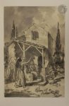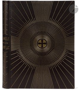 couverture illustrée. Maroquin bordeaux, plats ornés au centre d’une médaille dorée, ornée d’une croix en réserve, de laquelle jaillissent plusieurs filets dorés irradiants de différentes tailles, dessinant une grande croix ; dos lisse orné du titre et de filets dorés en V droit ou retourné, encadrement de maroquin bordeaux à l’intérieur, doublures de soie dorée ornée d’un dessin original à l’encre et lavis, gardes de soie noire chinée, doubles gardes, tranches dorées sur témoins, chemise à dos et bandes à rabats de maroquin bordeaux, étui (G. Cretté succ. de Marius Michel).. . Luxueuse édition tirée à 120 exemplaires numérotés sur papier japon, illustrée de 82 compositions de Jules CHADEL (1870-1941), dont une en frontispice et 2 hors texte sur double page, qu’il grava sur bois avec l’aide de Germaine de Coster et de Savinienne Tourette.. . Superbe exemplaire relié par Georges Cretté ; il est enrichi des pièces suivantes :. - 2 dessins originaux signés de Chadel sur soie dorée, placés aux doublures des plats, représentant pour le premier l’annonciation et pour le second la crucifixion.. - 4 esquisses originales au lavis signées sur japon, dont celles des doublures.. - 4 planches refusées signées par Chadel dont la belle et grande figure du taureau.. - L.A.S. de Chadel, 1 page in-4, adressée à « Mon cher Maître », datée de Paris, 14 janvier 1939, écrite sur papier japon et comprenant dans l’angle inférieur gauche un dessin original figurant Saint Jean en prison. Il y est question des dessins joints dans l’exemplaire et de la reliure de Cretté.. Ce dernier réalisa une reliure quasi identique sur un autre exemplaire de ce livre pour le vicomte Couppel de Lude.. Exemplaire parfaitement conservé.