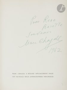 Draeger, Mourlot et l’Imprimerie Nationale, comprenant la reproduction en noir et en couleurs des projets, maquettes et dessins de Marc CHAGALL pour la réalisation des vitraux de Jérusalem.. L’artiste a réalisé deux lithographies originales spécialement pour cet ouvrage.. Exemplaire enrichi d’un envoi autographe de Chagall adressé à René Barotte, daté de 1962.. Critique d’art, Barotte consacra un ouvrage à Marc Chagall publié en 1961.. Exemplaire parfaitement conservé.