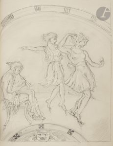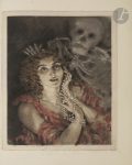 premier plat, bordée d’une bande de box vert, dos lisse, maroquin rose bordé d’une bande de box vert en encadrement à l’intérieur, tête dorée, non rogné, couverture et dos conservés, étui-boîte à dos et bandes de maroquin rose (reliure moderne).. . Édition tirée à 345 exemplaires, illustrée de 15 compositions à pleine page d’Édouard CHIMOT (1880-1959), gravées sur cuivre en couleurs.. . Un des 190 exemplaires sur vélin de Rives crème à la forme, comprenant les gravures dans leur état définitif en couleurs.. Exemplaire exceptionnellement enrichi des éléments suivants :. - suite en noir de toutes les illustrations,. - cuivre original de l’illustration de la page 43,. - 5 dessins ou croquis originaux dont un sur calque, à la plume et au crayon,. - 15 épreuves d’état de différentes illustrations du livre, la plupart annotées.. . Exemplaire en reliure amateur moderne, bien conservé.