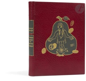 couverture, représentant une grande poire de maroquin gris dans laquelle est dessiné à l’or un homme moustachu sans pantalon entouré de pièces dorées de 1 francs, dos lisse orné de deux compartiments de maroquin gris portant respectivement le nom de l’auteur et le titre du livre, filet en pointillés dorés et fleur dorée aux angles à l’intérieur, tête dorée, non rogné, couverture et dos conservés, étui (René Kieffer). . . Édition originale tirée à 1050 exemplaires, illustrée de 47 compositions humoristiques de l’illustrateur et caricaturiste DUGO (1895-1957), dont une . argentée sur la couverture et 46 coloriées au pochoir dans le texte.. . Précieux exemplaire de l’éditeur René Kieffer, relié par ses soins.. Il s’agit d’un exemplaire imprimé sur japon, non numéroté, justifié de la main de Kieffer « Réservé à ma bibliothèque personnelle », accompagné d’une suite des illustrations sur chine.. Très bel exemplaire. Légères craquelures sans gravité aux charnières.. Provenance : René Kieffer.