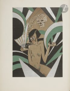 et le dos, formant des triangles irréguliers dont certains sont mosaïqués de chagrin blanc, violet et rouge, dos lisse, tête dorée, non rogné, couverture et dos conservés, étui (G. Chevillotte et E. de Verbizier).. . Édition originale illustrée de 20 compositions à pleine page et d’une figure sur la couverture du peintre et illustrateur Yan Bernard DYL (1887-1944) dont c’est l’une des plus brillantes productions, typiquement Art Déco.. . Tirage limité à 325 exemplaires ; celui-ci est l’un des 20 numérotés sur papier de Hollande comprenant une suite des illustrations sur le même papier.. Bon exemplaire en reliure de Chevillotte, bien établie mais présentant quelques défauts dans le décor réalisé par Eugène de Verbizier. Rousseurs aux deux premiers feuillets blancs.