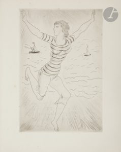 composés alternativement d’une bande verticale de veau bleu orné de filets dorés et d’une bande de velours noir, dos lisse, tête dorée, non rogné, couverture et dos conservés (reliure de l’époque).. . Édition originale, illustrée de 5 eaux-fortes originales hors texte de Léonard FOUJITA.. . Tirage limité à 301 exemplaires ; un des 275 sur vergé de Rives.. Exemplaire enrichi d’une L.A.S. de Léonard Foujita, 1 page in-12, Auteuil 17 février 1929, à propos d’un rendez-vous, et d’une L.A.S. de Michel Vaucaire adressée à Bernouard, 1 page in-12, auquel il demande de penser à envoyer des exemplaires de Barres parallèles à la librairie Crès.. Reliure amateur de moyenne qualité. Frottements d’usage, griffures sur le second plat. Rousseurs éparses, quelques traces de mouillures claires. Déchirure à l’angle supérieur de la couverture.