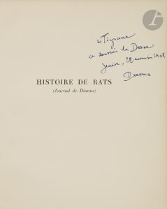 GIACOMETTI (Alberto) - BATAILLE (Georges).. Histoire de rats (Journal de Dianus).. Paris : Les Éditions de Minuit, 1947. — In-8, 202 x 164 : frontispice, 105 pp., (3 ff. 2 derniers blancs), 2 planches, couverture imprimée. Broché, couverture...