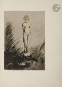 plat, nom de l’auteur « Colette Willy » en lettres dorées et noires sur le second plat, dos lisse orné en long du titre en petites lettres dorées et du nom de l’auteur en grandes lettres noires, maroquin vieux rose et bande de maroquin havane en encadrement à l’intérieur, fleur dorée aux angles, doublures et gardes de soie moirée verte, tête dorée, non rogné, étui (M. Bardach).. . Très belle édition tirée à 546 exemplaires, illustrée de 20 magnifiques eaux-fortes hors texte en couleurs du peintre et graveur Louis ICART (1888-1950), et comprenant le fac-similé d’une lettre de Colette.. Un des 425 exemplaires sur papier vergé à la forme de Rives.. Bon exemplaire malgré le dos passé et des défauts d’exécution dans la mosaïque de l’encadrement des contre plats. Sans la couverture.. Provenance : ex-libris héraldique.