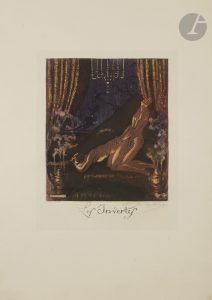 Tirage unique à 260 exemplaires de cette suite de 15 planches érotiques à l’aquatinte en couleurs, dont un titre, un feuillet de dédicace, 2 feuillets de citations, 10 planches légendées et un feuillet de justification. Cette illustration est l’œuvre du graveur et illustrateur suisse André Lambert (1884-1967) qui a utilisé ici son pseudonyme Ansaad de Lytencia.. Précieux exemplaire, un des 25 numérotés sur japon impérial, celui-ci comprenant la justification et tous les feuillets signés par l’artiste.. Exemplaire sans chemise ni étui.