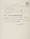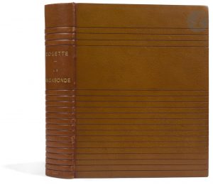 parcourant les plat et le dos, dos à multiples faux nerfs, encadrement de maroquin havane à l’intérieur, orné d’un filet doré et de filets à froid, doublures et gardes de soie moirée mauve, doubles gardes, tête dorée, non rogné, couverture et dos conservés, étui (Ad. Lavaux).. . Très belle et rare édition éditée sous la direction de Madame la Comtesse de Béhague, tirée à seulement 150 exemplaires et illustrée de 31 compositions du caricaturiste et dessinateur publicitaire Mich (1881-1923), dont 7 hors texte, reproduites en lithographie par Gaston Prost.. Un des 100 exemplaires réservés aux membres de la Société, celui-ci spécialement imprimé pour Ernest Goüin.. Il est enrichi de ce bel envoi de l’auteur : . à // Monsieur Goüin, // qui n’aime et n’accueille que // l’authentique, // en souvenir d’une fausse // vagabonde, d’une fausse // bohème, d’un écrivain qui // n’aime guère les livres, d’une // danseuse apocryphe, - enfin de // Colette. Bel exemplaire en reliure de Lavaux, enrichi du menu publié à la sortie du livre, illustré d’une composition de Mich, et de . 2 très rares suites des illustrations, l’une en noir, l’autre en couleurs, les deux avec remarques et comprenant même l’illustration du menu. La justification indique qu’il n’a été tiré que 15 suites des lithographies.. Frottements d’usage au dos, usures à l’étui. Traces de décharges sur les premières gardes blanches.. Provenance : Ernest Goüin, avec envoi de l’auteur.