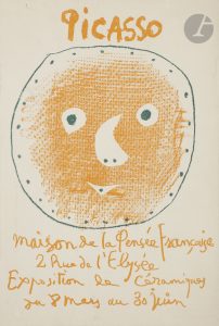 l’exposition de céramiques de Picasso, qui s’est tenue du 8 mars au 30 juin 1958 à la maison de la pensée française à Paris. La description des œuvres est précédée de deux textes d’Hélène Parmelin et de S. et G. Ramié.. Comprend 18 reproductions photographiques à pleine page, dont 17 en noir et une en couleurs, et une lithographie originale en 2 couleurs de PICASSO sur la couverture, tirée par Mourlot frères et imprimée à 1 000 exemplaires.. Exemplaire bien conservé.