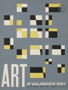 fondée par André Bloc – alors directeur de L’Architecture d’Aujourd’hui – et le peintre Edgard Pillet pour défendre l’abstraction géométrique et la synthèse des arts. La revue s’attache quelques grands noms de la critique d’art : Degand, Alvard, Gindertael, Estienne, Seuphor, etc. Le dynamisme de ses animateurs place Art d’aujourd’hui au cœur de nombreuses initiatives : éditions de publications sur l’art, sollicitations de son lectorat pour la réalisation de ses couvertures, liens étroits avec la Galerie Denise René ou encore réalisation de deux films sur l’art. Quant au noyau du comité de rédaction, il œuvre pour des projets de grande envergure. Ainsi de l’Atelier d’art abstrait qui se veut un lieu d’échanges pour les jeunes géométristes ; ou encore du Groupe Espace qui réunit tous les plasticiens et architectes désireux de travailler ensemble à la Reconstruction de la France. Autant d’activités dont l’évolution se lit dans les pages d’Art d’aujourd’hui » (Corine Girieud, Art d’aujourd’hui (1949-1954) hors les pages : une revue au cœur de l’action, 2006, in : La Revue des revues n°38).. . La publication se compose de 5 séries ainsi réparties :. Série 1 : N°1 à N°10/11 (Juin1949-Mai/Juin1950) ; Série 2 : N°1 à N°8 (Octobre 1950-Octobre 1951) ; Série 3 : N°1 à N°7/8 (Décembre 1951-Octobre 1952) ; Série 4 : N°1 à N°8 (Janvier 1953-Décembre 1953) ; Série 5 : N°1 à N°8 (Février 1954-Décécembre 1954), soit 36 livraisons comprenant 17 hors textes (lithographies, pochoirs, sérigraphies) de Jean Dewasme (n°4 série 2), Fernand Léger (n°1 série 3), Alberto Magnelli (n°2 série 3 et n°2-3 série 5), Vasarely (n°5 série 3), Kandinsky (n°6 série 3), Jacques Villon (n°1 série 4), Ben Nicholson (n°2 série 4), Juan Gris (n°3-4 série 4), Deyrolle (n°5 série 4), E. W. Nay (n°6 série 4), Carlsund (n°7 série 4), Sophie Taueber-Arp (n°8 série 4), André Bloc (n°1 série 5), Hartung (n°6 série 5), Willi Baumeister (n°7 série 5) et Herbin (n°8 série 5).. . Les numéros de la première série sont abîmés ; les deux feuillets de la couverture du numéro double 7-8 sont notamment défaits et déchirés.
