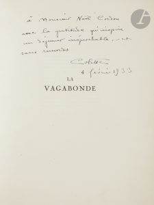 d’un décor incrusté fait de pièces de velours de différentes couleurs figurant un bois, second plat orné du même décor incrusté mais dessiné à l’aide de filets dorés et noirs, tête mouchetée et peinte, non rogné, couverture et dos conservés, étui (Paul Blocteur).. . Édition tirée à 305 exemplaires, illustrée de 15 lithographies hors texte en couleurs de Marcel VERTÈS (1895-1961).. Un des 230 exemplaires sur vélin de Hollande, enrichis d’une suite des illustrations en sanguine.. Exemplaire enrichi de cet envoi de l’auteur à Noël Cordon : . à Monsieur Noël Cordon // avec la gratitude qu’inspire // un déjeuner irréprochable, . - et // sans remords // Colette // 4 février 1933. Noël Cordon était président du tribunal de commerce de Rennes.. On trouve également au dos du frontispice un envoi de l’artiste adressé à Monsieur Gallié.. Exemplaire en modeste reliure amateur signée de Paul Blocteur, présentant de nombreux défauts d’exécution dans le décor des plats.. Provenance : Noël Cordon, avec envoi de l’auteur (vente 25 février 1939, n°80, vendu à l’époque broché). - M. Gallié, avec envoi de l’artiste.