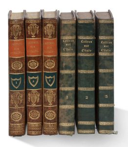 publiée par Antoine Sérieys, de ces lettres célèbres évoquant l'Italie du XVIIIe siècle..Joint: Lettres historiques et critiques sur l'Italie. Paris, Ponthieu, An VII de la République [1799]. 3 volumes in-8, demi-basane, dos lisse, tranches jaspées (Reliure de l'époque)..Édition originale. Bel état intérieur.