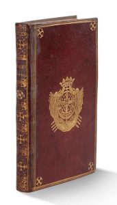 adaptés aux principales Villes du Royaume et de l'Europe; avec l'indication des Moyens de Finance & d'Économie, qui pourroient servir à remplir ces vuës. Paris, Gueffier, 1767..In-8, plein maroquin rouge armorié de l'un des «Chevalier du Saint Esprit», triple filet doré sur les plats, croix pattée aux angles, dos lisse orné, filet doré sur les coupes, dentelles florales intérieur, gardes en papier gaufré, tranche dorée (Reliure de l'époque)..Première édition de cet ouvrage divisé en deux parties, orné de deux frontispices en taille-douce et de trois planches gravées..Dussaussoy fait part, dans cet ouvrage consacré à l'utilité public, de certains de ces projets pour la ville de Paris tel que l'agrandissement des Halles & Marchés, l'Achèvement du Louvre..Ex-libris du Comte Stanislas d'Imécourt..Coins émoussés, mors légèrement passés.