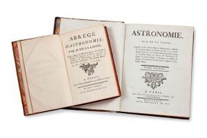 l'époque)..Édition originale qui mettra Lalande au premier rang des astronomes européens. Il destine cet ouvrage surtout aux jeunes astronomes: «Je déclare sans peine qu'il doit y avoir beaucoup de fautes dans mon ouvrage [...] D'ailleurs je n'ai pas pris beaucoup de peine pour chercher une faute; il y avait trop de temps à perdre et trop d'ennui à éprouver...»..Complet de ses 11 planches dépliantes hors textes..Manque sur la coupe supérieure du premier plat, quelques griffures aux plats, coins émoussés..Manque le second tome..Joint: Lalande (Joseph-Jérôme Lefrançois, de.).Abrégé d'Astronomie. Paris, Veuve Desaint, 1774..In-8 plein veau marbré, dos à nerfs orné, roulette dorée sur les coupes, tranche rouge (Reliure de l'époque)..Édition originale de son propre traité d'astronomie, illustrée de 16 planches gravées dépliantes.