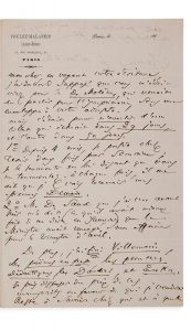 l'écrivain Paul de Molènes, de son essai sur le peintre Constantin Guys, de sa demande d'indem­nité littéraire auprès de Jules Desaux chef de cabinet au ministère, et du prix de ses manuscrits dont sa traduction d'un texte de Poe, certains encore inédits....Mon cher, en voyant votre écriture, j'ai d'abord supposé que vous m'écriviez pour le De Mo­lènes, qui venait de partir pour l'imprimerie, sous une enveloppe à votre adresse. Mais c'était pour m'avertir d'un billet qui échoit dans 29 jours et l'autre dans 50 jours. 1er depuis 4 mois, je passe chez Texier deux fois par semaine; je le tourmente en lui disant que vous me tourmen­tez. A chaque fois, il me dit que je vais recevoir mes épreuves demain [L'article sera finalement publié dans le Figaro en 1863]. 2ème M. De Saux que j'ai vu avant-hier m'a dit (...) que le ministre avait renvoyé mon affaire (...). De plus, j'ai FINI le Villemain, les poëmes en proses, les peintres didactiques, les Dandies et Eureka [traduction d'Edgar Allan Poe]. Je puis disposer du prix de ces manuscrits en faveur de qui je voudrai. Reste à savoir chez qui et à quelle date paraî­tront ces morceaux qui ne sont pas tous placés. Baudelaire ajoute en gros caractères: Jamais je n'oublie rien (...).