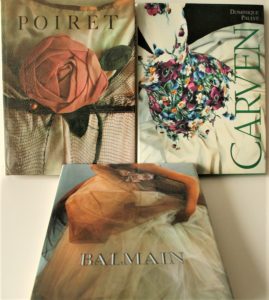 1. Paul POIRET 1879-1944 par Yvonne Deslandres, Editions du Regard, 1986, 2. Dominique PAULVE : CARVEN, Editions GRÜND, 1995, 3. Gérard-Julien SALVY : Pierre BALMAIN, Editions du Regard, 1995