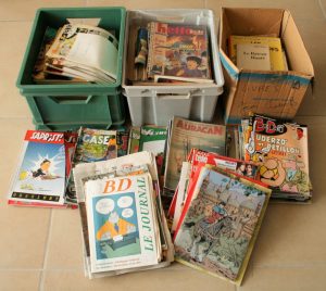 2 caisses de la bande dessinée JUNIOR des années 50 aux années 70, 1 caisse de la revue Hello BD des années 90, 1 caisse de revues ou magazines sur la Bande dessinée : Asterix & Obélix, XIII, Black & Mortimer, revues généraliste ou coupures...