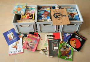 3 caisses du Journal de TINTIN des années 70 et 80 accompagnés de revues sur Hergé et/ou Tintin, billets d'entrée à des expositions, cahier de vignettes à coller, sachet à l'effigie de Tintin, calendriers…