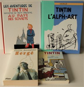 Ensemble de 4 ouvrages sur TINTIN : 1.Tintin et l'Alph-Art : Version Luxe, Casterman, 1993 (état neuf), 2.Frédéric TUTEN : Tintin au nouveau monde, roman, 1995, 3. Pierre ASSOULINE : Hergé, Plon, 1996, 4. Les aventures de Tintin au pays des...