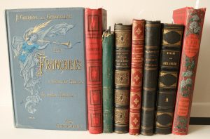1. Charles DICKENS : Les contes choisis, reliure de ENGEL, plat de SOUZE , 2. Charles DUBOIS : Récits d'un Alsacien, 1873, 3. GOURDON de GENOUILLAC : Les Françaises à toutes les époques de notre Histoire, reliure de ENGEL, 4. Jean MACE : Histoire...