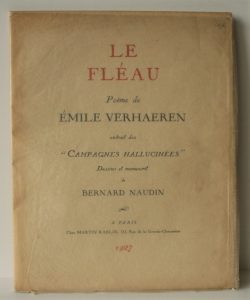 H.C. avec envoi et signature autographe de l'éditeur Kaelin à Monsieur Regaud : «fac-similé fait par Bernard Naudin, sur le désir du poète Emile Verhaeren, avec les dessins que l’illustrateur avait exécutés pour le maître». Bel exemplaire avec 2 feuilles avec illustration en couleurs du prochain livre de l'éditeur pour 1928