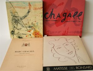 1. Salvador DALI : Literarische Zyklen (Graphische Werke), Königswinter: Schloß Drachenburg, 1982, 2. Marc CHAGALL : exposition musée municipal de Kyoto, 1963, 3. MATISSE : Florilège des amours de Ronsard, Editions Albert Skira, 1993, 4. Marc...