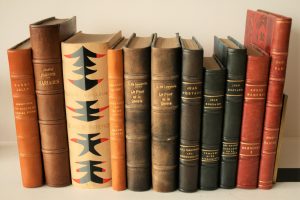 Ensemble de 11 sous reliure 1/2 cuir : 1. Raoul CELLY Répertoire des thèmes de Marcel Proust 1935, 2. Charles PLISMIER : Mariages 1936 (photo et envoi autographe signé), 3. Louis GUILLOUX : Le jeu de patience 1949 (Bonnet) (envoi autographe...