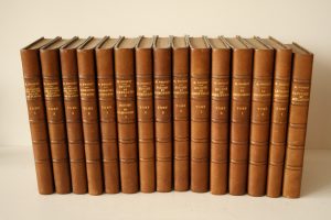 Ensemble de 15 volumes de PROUST, certaines en édition originale, sous reliure 1/2 cuir, dos à 5 nerfs, tête dorée : A l'OMBRE DES JEUNES FILLES EN FLEURS en 3 volumes, NRF 104e édition 1919, ALBERTINE DISPARUE en 2 volumes, édition originale...