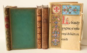 Paris chez Antoine-Urbain Coustelier, 1723, reliure In-12 plein cuir de l'époque, manque la pièce de titre, 3. BLIN de SAINMORE : Oeuvres complètes de M. le C. de B *** - à Londres, 1767, Tome 1 seul, reliure plein maroquin, 4. Cahier de pages vierges avec une enluminure sur la couverture signée E. Giandotti
