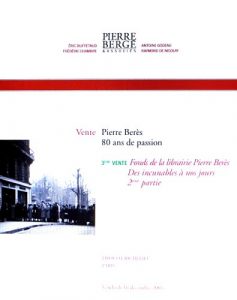 FONDS PIERRE BERES - 80 ANS DE PASSION. Des incunables à nos jours. L'une des grandes raisons du succès de Pierre Berès dans sa carrière de libraire tient à cette parfaite maîtrise de la bibliographie dont il a toujours su faire preuve, dans ses catalogues comme au gré de sa conversation. Pierre Berès a comme transformé une fois pour toutes en une savante alchimie appelée goût cette masse de livres, en apparence indisctincte, que les anglais nomment books about books.