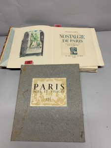 vélin pur chiffon de Lana contenant une décomposition des couleurs et du noir des gravures sur cuivre en deux planches. Envoi autographe signé de l'auteur à Edmond Buëvoz On joint : Paris, âges et visages. Paris, Odé, [vers 1943]. In-4, en feuilles sous chemise à rabats cartonnée éditeur. Illustrations de Dignimont, Touchagues, Grau Sala et Clavé. Soit 2 volumes.